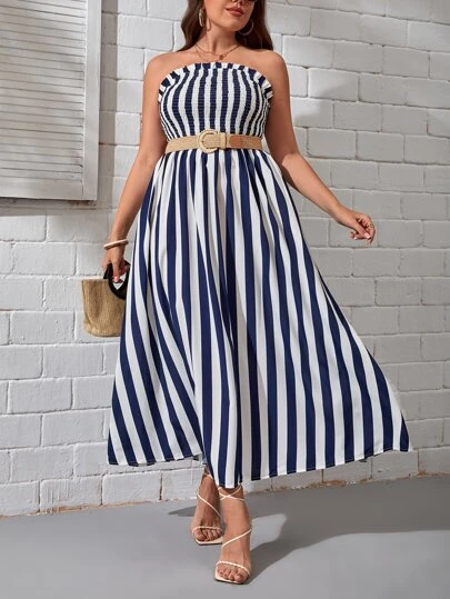 SHEIN VCAY 大碼條紋印花抹胸連衣裙不附腰帶