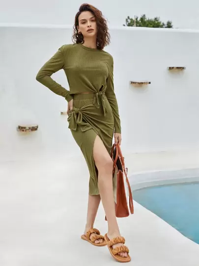 SHEIN VCAY 素色打結細節上衣和裹身裙套裝 - 橄欖綠 - 查看 1