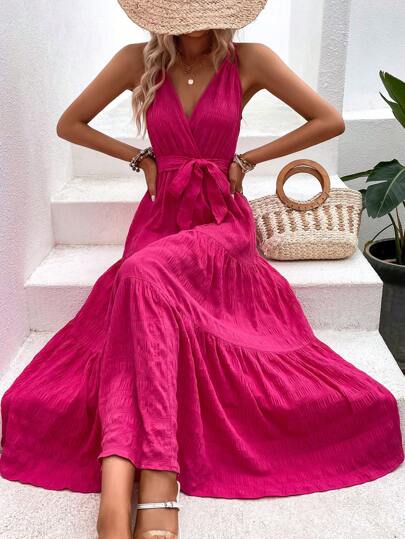 SHEIN VCAY 素色荷葉邊腰帶吊帶洋裝 - 玫紅色 - 查看 1