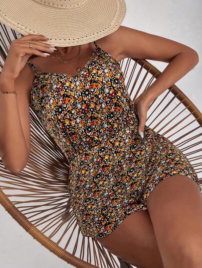SHEIN VCAY 夏季海滩女士花卉印花吊带连体衣 - 灰色 - 查看 1