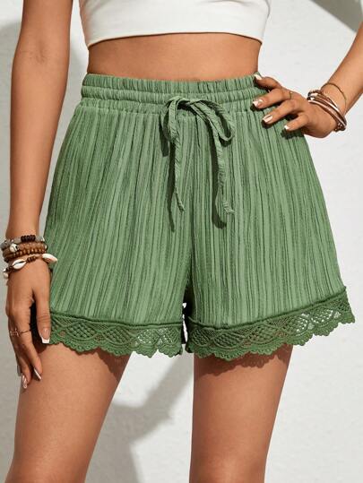 SHEIN VCAY 女士纯色撞色蕾丝束带宽松短裤