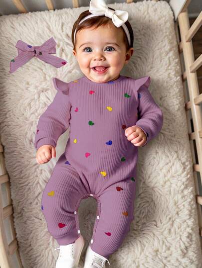 SHEIN 情人节新生儿爱心印花连体衣,舒适针织休闲连体衣配发带,秋冬季款 - 紫色 - 查看 1