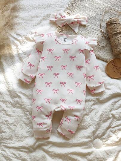 SHEIN 情人节新生儿爱心印花连体衣,舒适针织休闲连体衣,含发带,秋冬季款 - 粉色 - 查看 1
