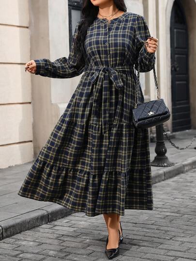 SHEIN 复古花卉格纹圆领泡泡袖大码女装连衣裙,女士秋季穿搭,新年穿搭,圣诞节连衣裙 - 彩色 - 查看 1