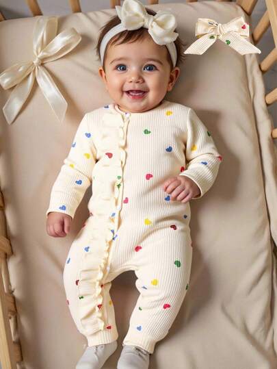 SHEIN Vintaside Kids 女婴休闲爱心印花荷叶边长袖连体衣,秋冬款 - 杏色 - 查看 1