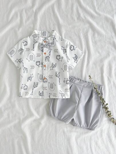 SHEIN Vintaside Kids 幼儿男童可爱动物印花乡村风格时尚基本款百搭舒适休闲两件套 T 恤套装,春夏 - 淺灰色 - 查看 10