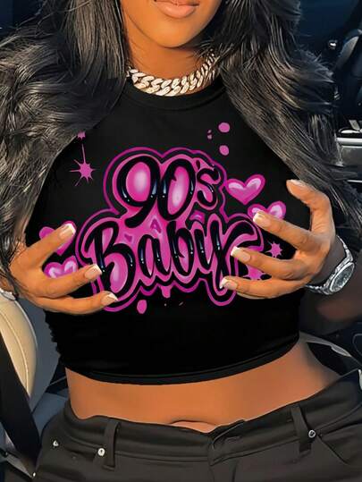 SHEIN 女士休闲字母印花修身短款上衣 T 恤,夏季