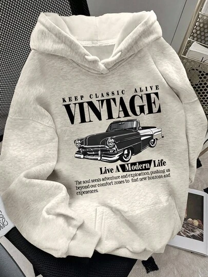 SHEIN 女士秋冬标语及汽车图案印花保暖休闲卫衣,圣诞节 - 淺灰色 - 查看 1