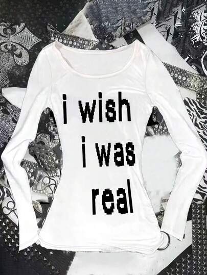 SHEIN 女式字母印花圆领时尚修身长袖T恤 - 白色 - 查看 1