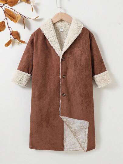 SHEIN 男小童前紐扣加絨內裏外套 - 棕色 - 查看 1