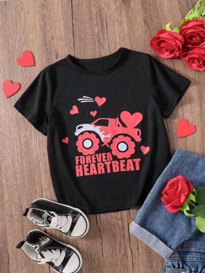 SHEIN 年轻男孩休闲汽车和心形字母印花 T 恤 - 黑色 - 查看 1