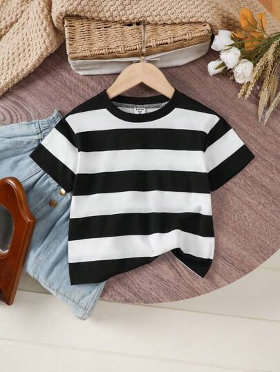 SHEIN 年轻男孩休闲条纹圆领短袖 T 恤,夏季 - 黑與白 - 查看 6