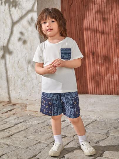 SHEIN 年輕男孩印花拼接口袋t恤和短褲