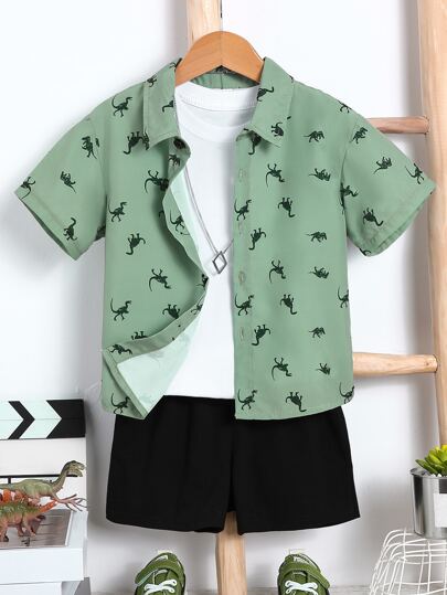 SHEIN 小男童恐龍印花襯衫和短褲不帶T恤 - 彩色 - 查看 1