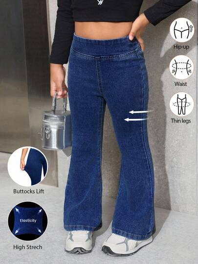 SHEIN 少女蓝色牛仔弹力紧身喇叭裤 - 深色水洗藍 - 查看 1