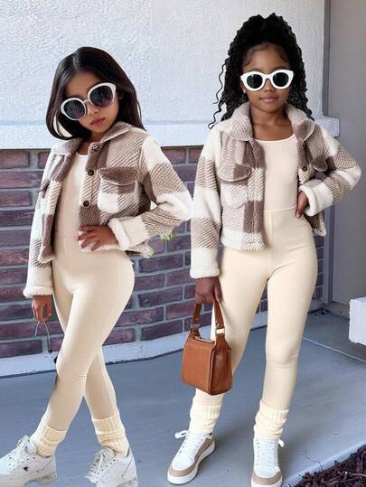 女小童大格紋翻蓋口袋毛絨夾克&吊帶連體褲 - 彩色 - 查看 1