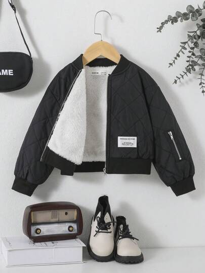 SHEIN 女孩休閒棒球領中厚短夾克,梭織布料 - 黑色 - 查看 1