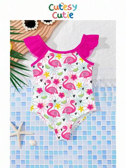 SHEIN 女童可爱卡通草莓印花荷叶袖连体泳衣,春夏款 - 彩色 - 查看 1