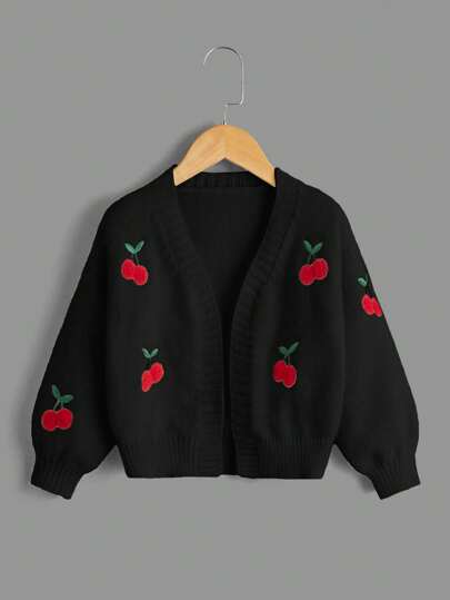 SHEIN 少女时尚百搭樱桃刺绣长袖开衫,秋冬 - 黑色 - 查看 1