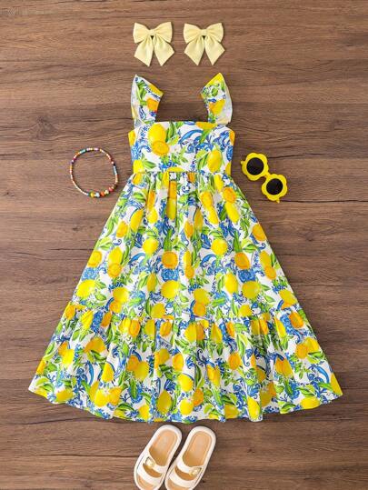 SHEIN 年轻女孩柠檬印花荷叶边袖长裙,暑假,妈妈和女儿及姐妹搭配风格,适合家庭度假,假期,海滩度假, - 彩色 - 查看 1
