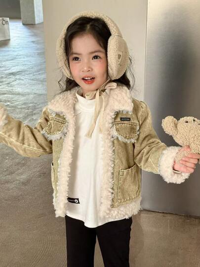 SHEIN 年轻女孩的千禧甜美海军蓝牛仔保暖内衬夹克,秋冬