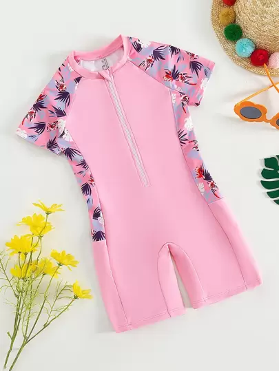 SHEIN 少女植物印花拉鍊前開式一件式泳衣 - 粉色 - 查看 1