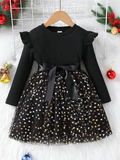 SHEIN 女小童荷葉邊拼接星星網紗邊繫腰帶洋裝 - 黑色 - 查看 1