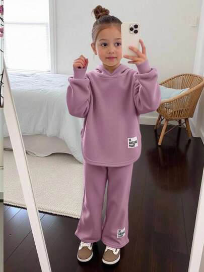 SHEIN 年轻女孩街头服饰连帽运动衫和裤子套装,不对称下摆,2 件套 - 淡紫色 - 查看 1