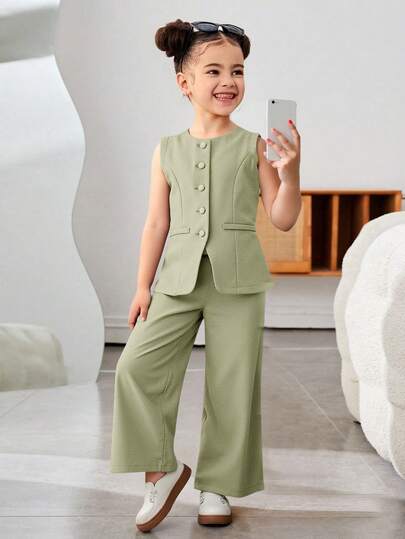 SHEIN 年轻女孩通勤休闲纯色梭织无袖圆领上衣和直筒裤套装,法式 - 綠色 - 查看 1