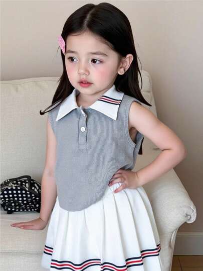SHEIN 女童马球领无袖上衣 + 百褶迷你裙 2 件套,夏季 - 灰色 - 查看 1