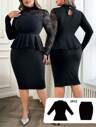SHEIN Privé 大码优雅蕾丝拼布圆领长袖简约 T 恤,休闲日常穿着