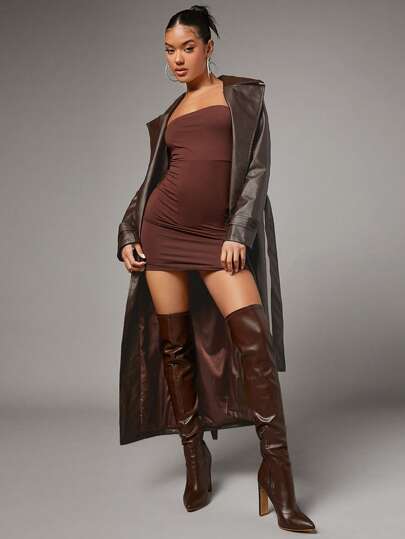 SHEIN x Carly Lawrence SHEIN BAE 秋冬款纯色PU皮革腰带优雅风衣 - 咖啡棕 - 查看 1