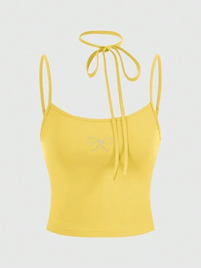 SHEINNeu 可爱甜美夏季粉色蝴蝶结水钻蕾丝白色百搭基本款吊带背心 - 黃色 - 查看 1