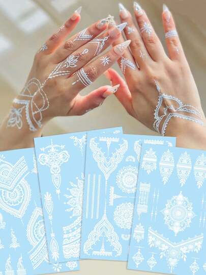 STARTTOOS 白色指甲花曼陀罗花朵图案蕾丝丝带临时防水纹身贴纸,适合女性,性感人体艺术,适合婚礼 - 白色 - 查看 1