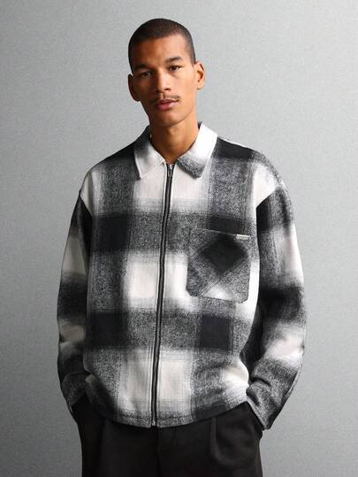 SUMWON 经典水牛格纹羊毛混纺夹克,前拉链闭合,大格子图案,温暖冬季休闲外套 - 黑與白 - 查看 1