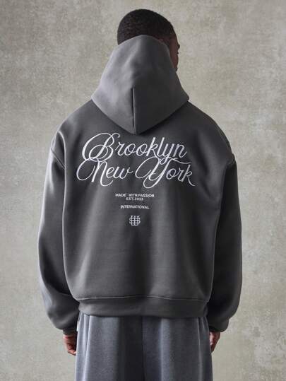SUMWON 布鲁克林纽约国际刺绣超大连帽衫重磅秋冬街头服饰都市时尚抽绳套头衫袋鼠口袋2023系列 - 深灰色 - 查看 2