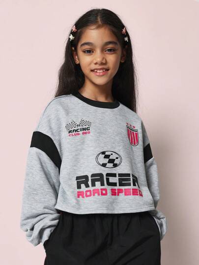 SUMWON 赛车俱乐部赛车运动短款运动衫,带格子旗图案,优质校队风格赛车时尚街头服饰长袖套头衫 - 灰色 - 查看 1