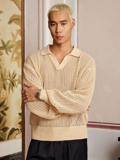 SWAVVY 男士纯色立领长袖休闲宽松针织上衣 - 芥末黃 - 查看 1
