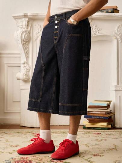 SWAVVY 个性化时尚纽扣口袋阔腿男士牛仔短裤 - 藍色 - 查看 1