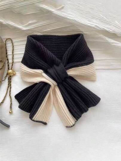 围巾女短款秋冬交叉针织围巾韩版撞色百搭冬季保暖护颈网红潮流 - 1pcs - 查看 1