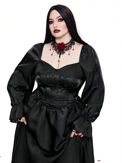 Flirla 大码浪漫纯色腰部合身长袖连衣裙哥特女装 - 黑色 - 查看 1