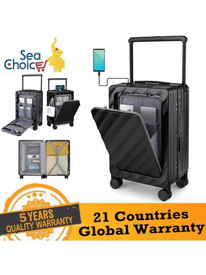 Sea Choice 55cm Carry On Luggage With Front Laptop Compartment Lock Pocket Hard Shell PC Aluminum Frame Closure Spinner Travel Trolley With YKK Zipper TSA Lock - 黑色 - 查看 1