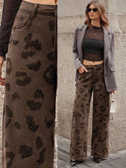 Selenza 女士时尚水钻装饰印花牛仔裤 - 棕色 - 查看 1