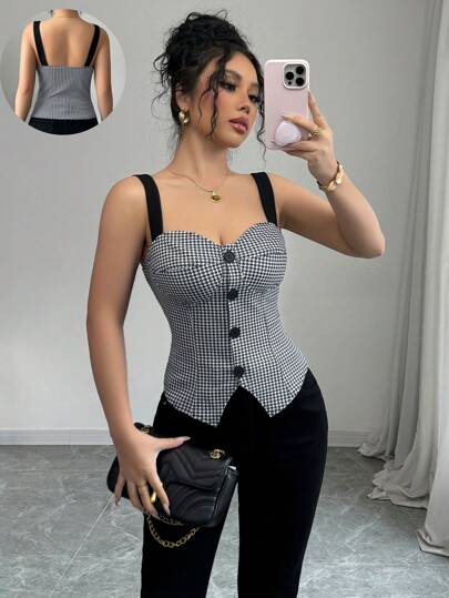 Selianne 时尚百搭吊带背心 黑色单排扣修身千鸟格图案女式吊带背心 - 彩色 - 查看 1