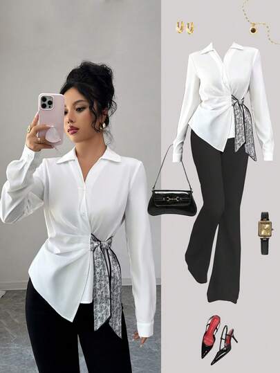 Selianne 女士佩斯利花纹侧结长袖不对称衬衫 - 白色 - 查看 1
