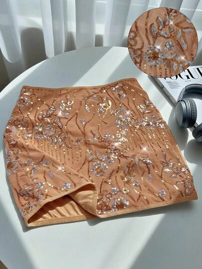 Modelyn 亮片刺绣短款女士时尚优雅迷你裙 - 卡其色 - 查看 1