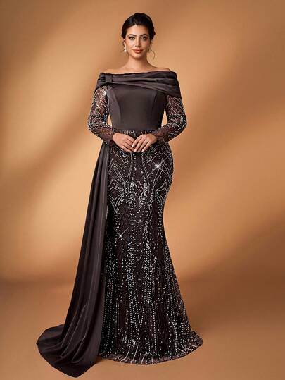 Serin 大码优雅奢华咖啡色露肩礼服,饰有串珠和亮片,褶皱袖,鱼尾裙摆,适合婚礼、派对、度假、舞会、新娘母亲晚礼服