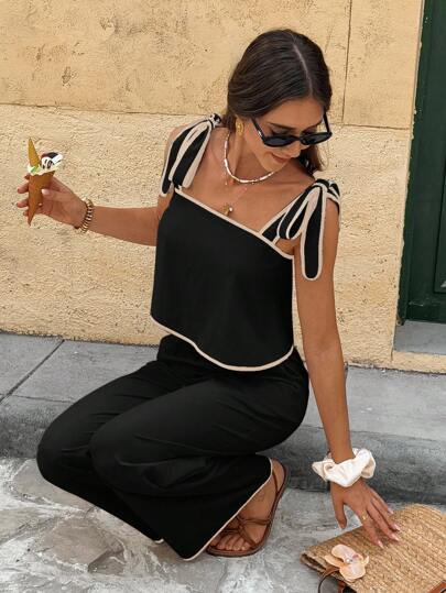 Serisse 女士吊带背心和口袋裤休闲两件套 - 黑色 - 查看 1