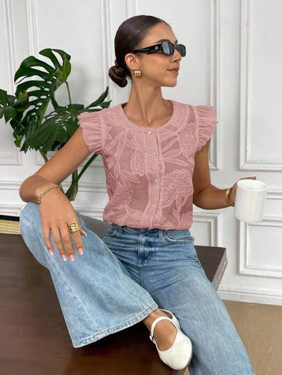 Serisse 女式花卉提花圆领盖袖单排扣时尚衬衫 - 藕粉色 - 查看 1