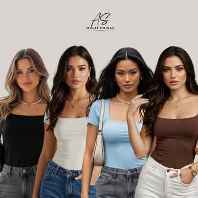 Set Of 4 Baby Look Blouses With Double Front Lining And Square Neckline. Simple. None. Vacation. Beach.